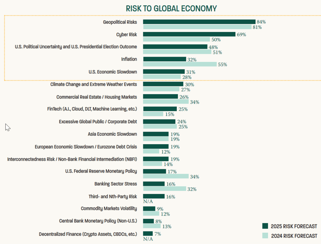 For the fourth consecutive year, geopolitical risks and trade tensions topped the list, with 78% of respondents highlighting these factors as critical to the global financial landscape.